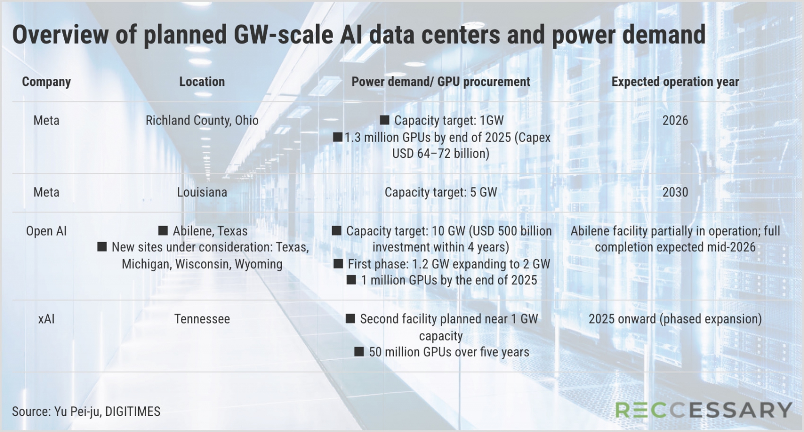 As AI data centers scale up, GPU power consumption is rising sharply. According to DIGITIMES analyst Yu Pei-ju (余佩儒), a single AI chip is expected to consume more than 2 kW, pushing overall demand from the MW-scale into the GW level. Companies including OpenAI and Meta are already making preparations, with GW-scale AI data centers projected to come online as early as next year.