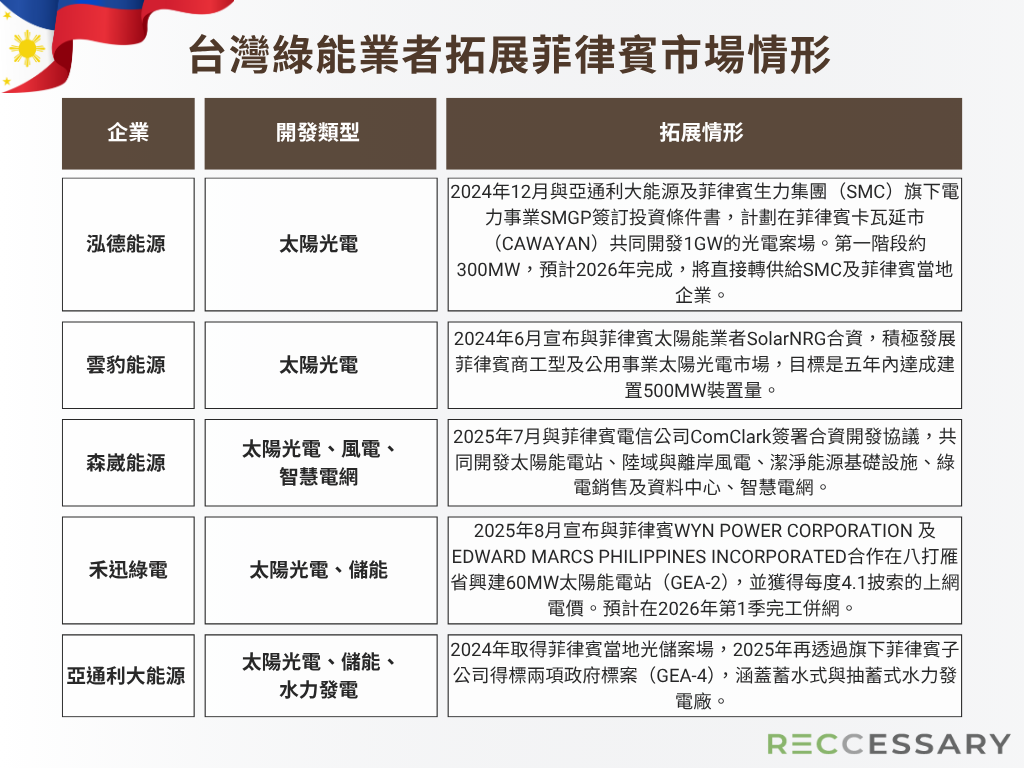 迄今已有不少台灣綠能業者布局菲律賓市場,例如森崴能源、雲豹能源、泓德能源等紛紛插旗菲律賓。在合作模式上,台商大多採取與當地企業策略聯盟或合資,利用當地夥伴對土地、法規及政府關係的熟悉度,以克服市場進入障礙。