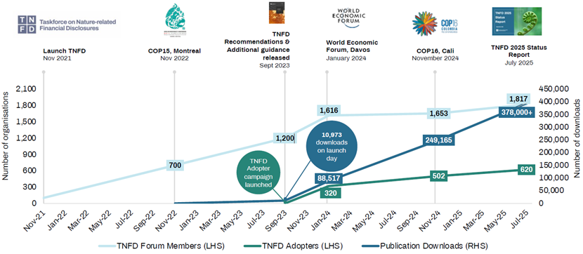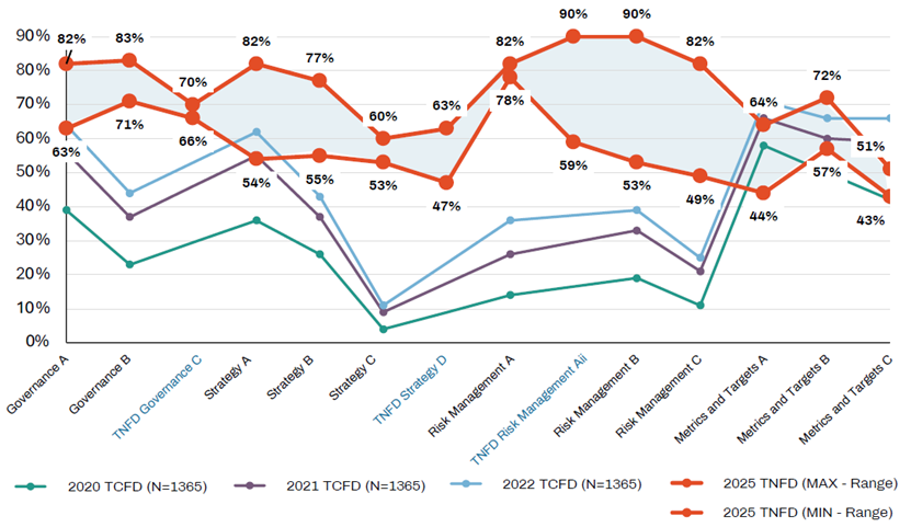 TNFD框架自2023年9月發布建議以來,其市場意識和初步採用的進展速度令人驚訝。與其報告領域的前身氣候相關財務揭露工作小組(The Force on Climate-Related Financial Disclosures, TCFD)相比,TNFD的早期採用速度更快速。這表明市場對整合新的永續性框架的準備程度已大幅提高,利害關係人對快速、高品質報告的期望也遠高於十年前對氣候報告的期望 。