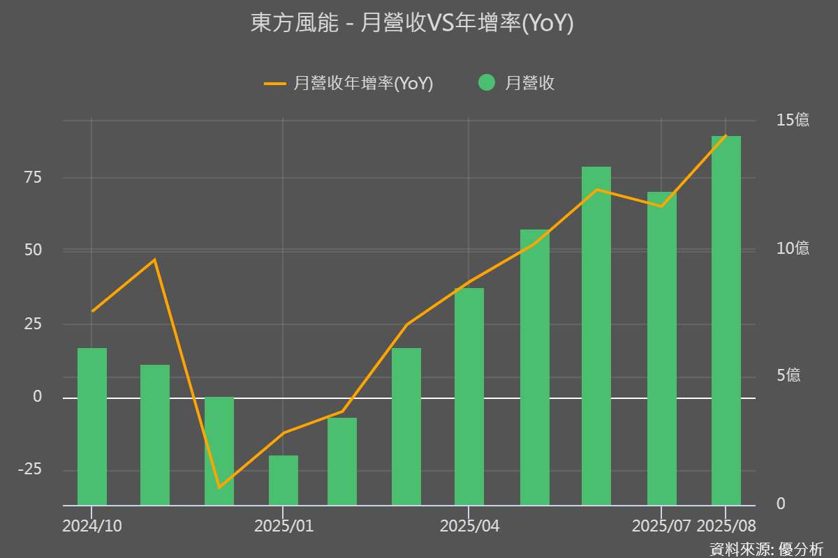 營收數據顯示,公司近年成長明顯。2021 至 2023 年營收呈爆發式增長,年複合成長率超過 100%,2024 年再度推升約 36%。2025 年延續動能,前五個月年增率達 28.8%,今年前八個月累計營收突破 70 億元新台幣,年增率超過五成。每月營收波動中仍展現整體上升趨勢,主因來自船隊擴張與合約貢獻。市場預估東方風能全年營收與獲利有望再創新高。
