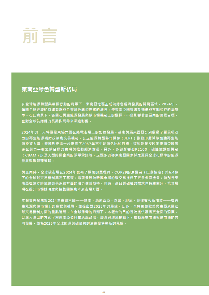 - 在全球淨零浪潮下,東南亞正成為綠色經濟新戰場。東協六國加速能源與碳市場布局——越南、馬來西亞推出新補貼與交易機制,印尼透過JEPT強化減碳投資,泰國提高2037再生能源目標。這些政策不僅影響區域氣候承諾,更重塑全球供應鏈。同時,COP29推進《巴黎協定》第6.4條,跨境碳交易與高品質碳權需求迅速升溫。