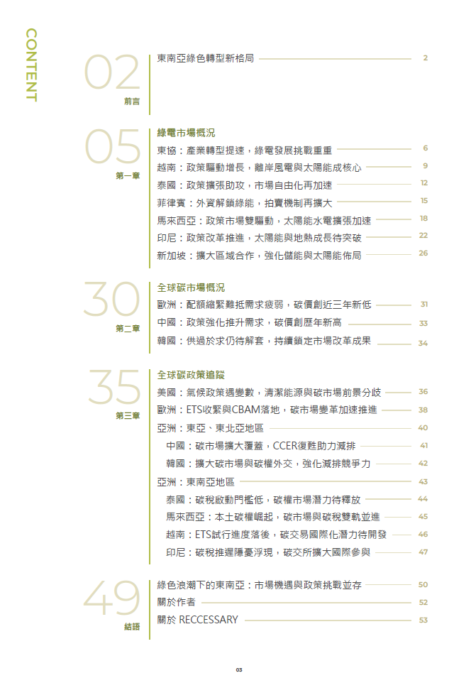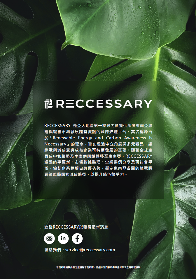 在新能源與碳市場瞬息萬變的今天,掌握第一手資訊就是企業贏家的關鍵。RECCESSARY 市場報告訂閱,專為企業決策者與專業人士打造,提供最完整的政策洞察、碳市場動態、價格趨勢與實務案例分析。無論季度深度報告或年度全景分析,每份報告都以數據為核心,助您精準評估風險、抓住商機。立即訂閱,專屬洞察隨手可得,從綠電採購到碳成本評估,每一份資訊都是推動策略落地的利器。選擇 RECCESSARY,讓市場洞察轉化為企業行動力,領先競爭對手,掌握未來!
