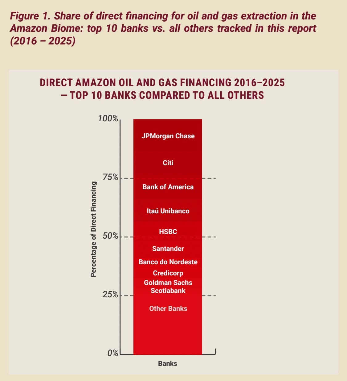 These numbers are part of a new report, “Banks vs. The Amazon,” which uncovers how global financial institutions continue to direct resources toward oil and gas extraction in Amazonia, contributing to the destruction of the rainforest and the rise of carbon emissions that contribute to higher global temperatures — despite some banks having adopted policies to end this.