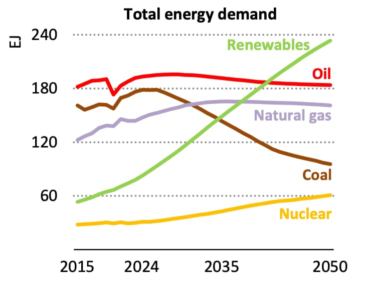 The CPS would see oil and gas use continuing to rise, with demand for oil reaching 11% above current levels by 2050 and gas climbing 31%, even as renewables nearly triple.