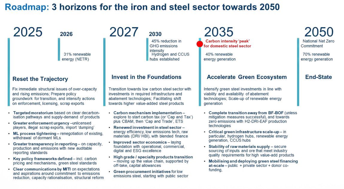 To drive steel sector decarbonization, the government would like to roll out a carbon tax as early as 2026, according to SIR2035. Proceeds would be allocated to a new Carbon Competitiveness Fund to finance low-carbon technology adoption, market expansion, and export competitiveness.