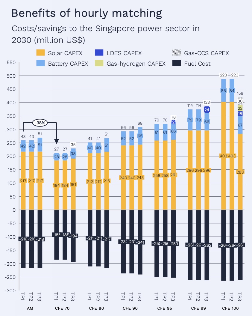 Achieving 70% CFE would cost Singapore USD 47 million less in capital expenditure than the conventional annual matching approach, TransitionZero finds. (Chart: TransitionZero)