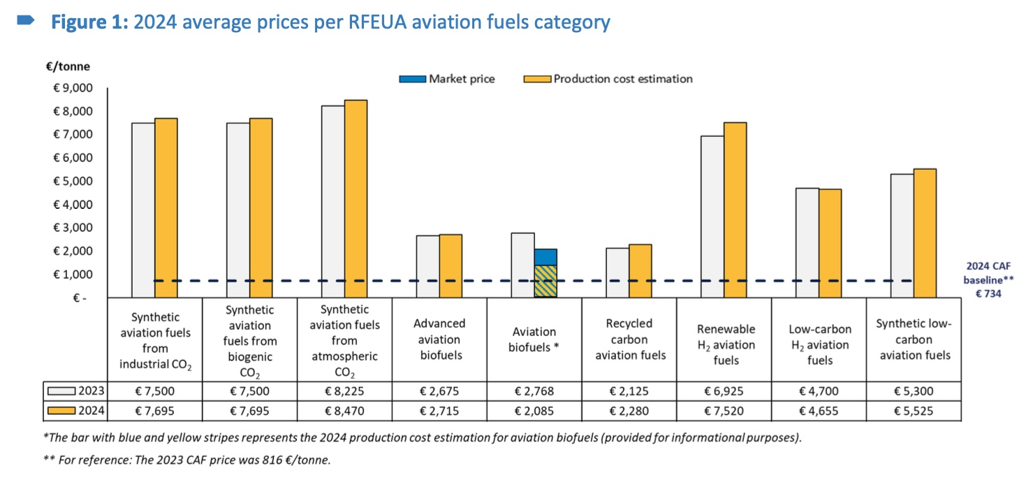 SAF currently costs about three times more than conventional fossil-based jet fuel. (RFEUA: The ReFuelEU Aviation Regulation, CAF: conventional aviation fuel) (Chart: EU Aviation Safety Agency)