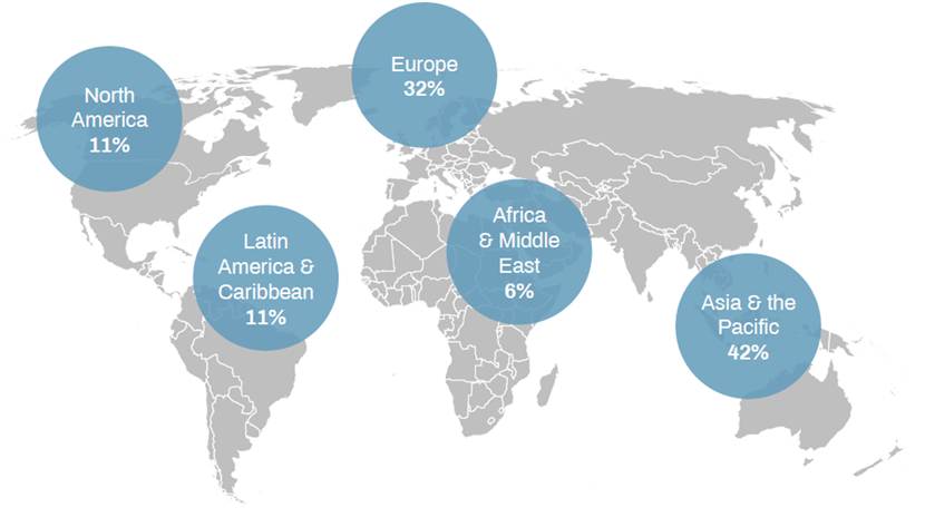 這種市場動能並非自發產生,而是由強大的監管壓力(Regulatory Push)和投資者需求(Investor Pull)這「雙引擎」共同推動 。全球範圍內,有超過 1,800 個組織加入 TNFD 論壇。地域分佈方面,亞洲及太平洋地區占 42%最高,歐洲占 32%居次。在企業方面,製造業(25%)、食品/飲料與農業(19%)及材料業(8%)為主要參與行業。在金融機構中,商業銀行(22%)、資產管理(22%)及保險業(10%)的參與度較高。