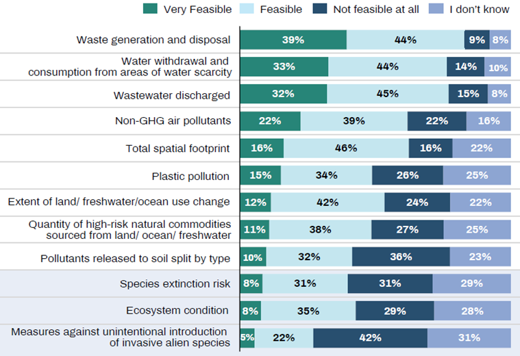 - 最不可行:企業組織在處理需要外部生態數據和複雜科學評估的指標時面臨重大挑戰(例如:針對入侵性外來物種的措施(13%)、物種滅絕風險(18%)、生態系統狀況(24%))。
