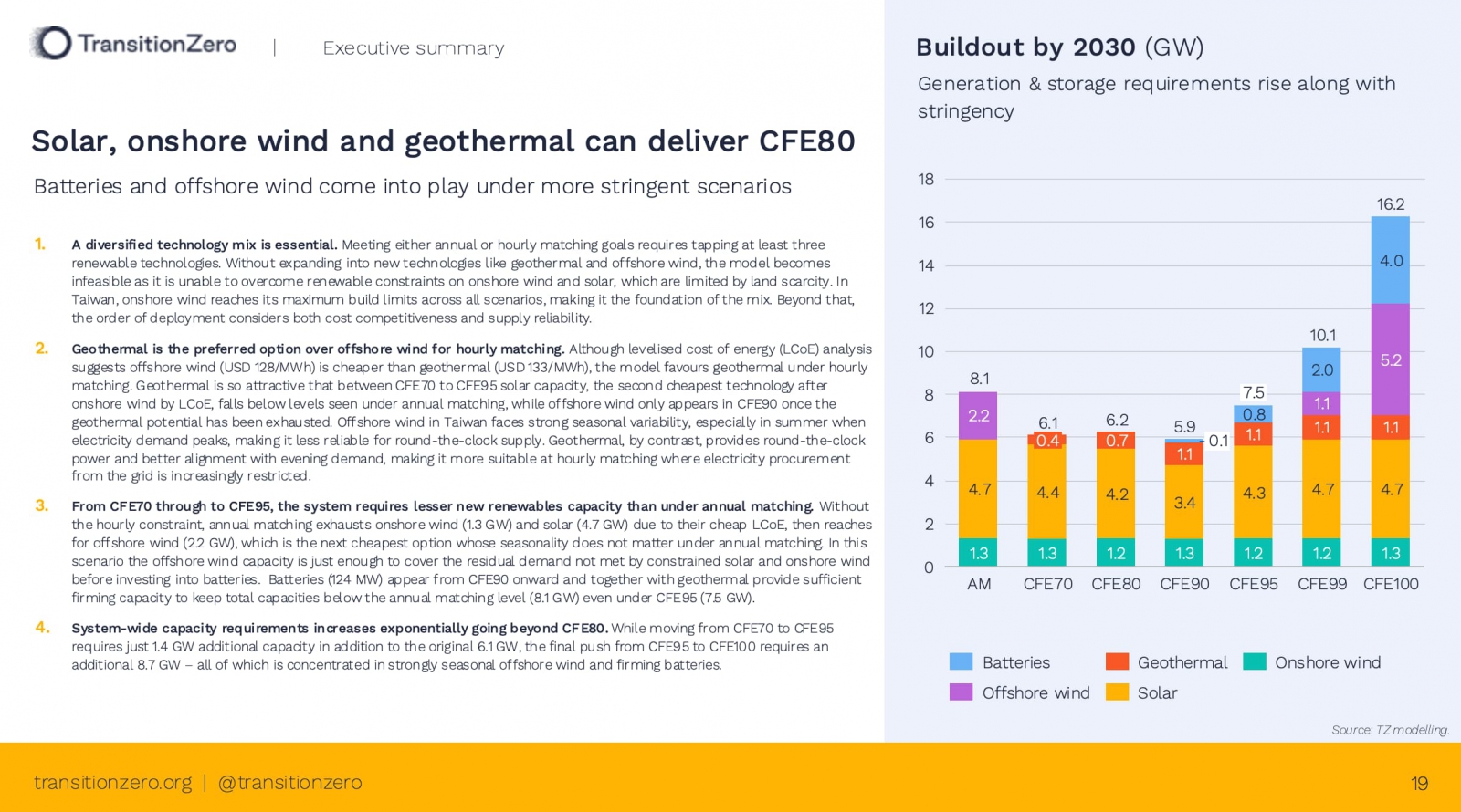 若台灣要達成80%的CFE(CFE80),報告認為發展重點應放在太陽能、陸域風電與地熱3項技術,不需要採用成本相對昂貴的離岸風電與電池技術。路塔進一步說明,台灣在2025至2030年間,除了原本預期綠能建置外,仍需額外新增約4.2 GW(百萬瓩)太陽能、1.2GW陸域風電及0.7GW地熱發電容量,才能達成CFE80。