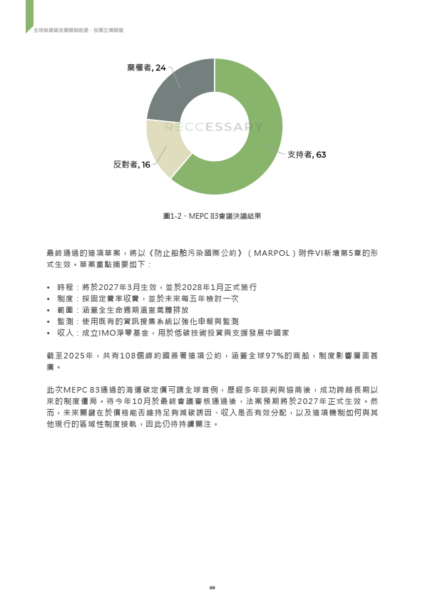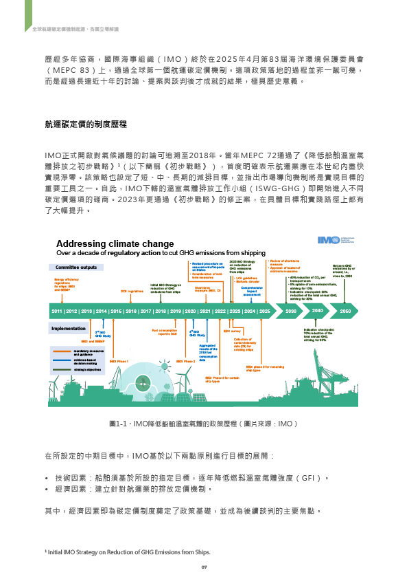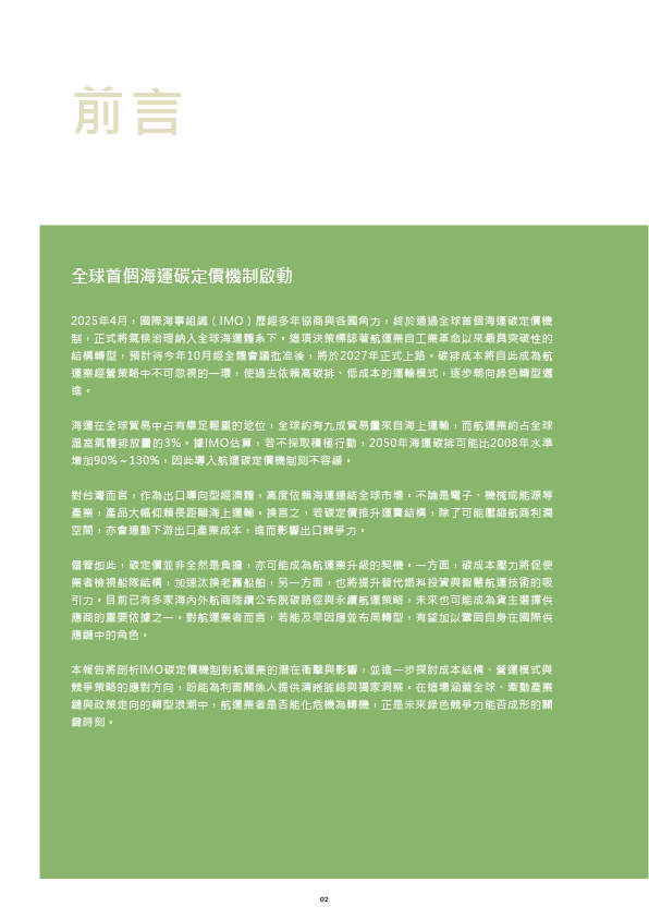 - 全球約9成貿易量來自海上運輸,航運業約占全球溫室氣體排放量的3%,面對減碳議題刻不容緩。在歷經近十年的討論,國際海事組織(IMO)於2025年4月通過全球首個航運碳定價機制,預計2027年生效,未來航運業者得將碳排納入成本計算。面對碳定價時代,也是航運業升級轉型的好時機,透過及早布局低碳營運策略與掌握風險,才能在國際供應鏈上占有優勢地位。